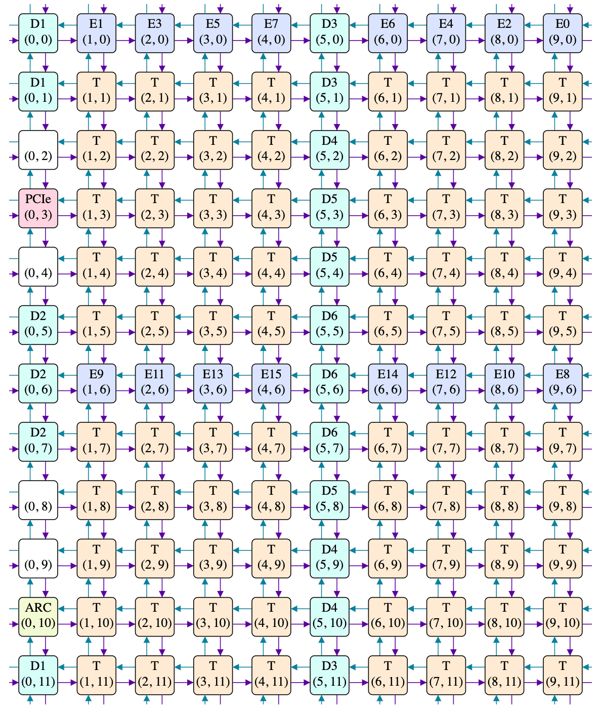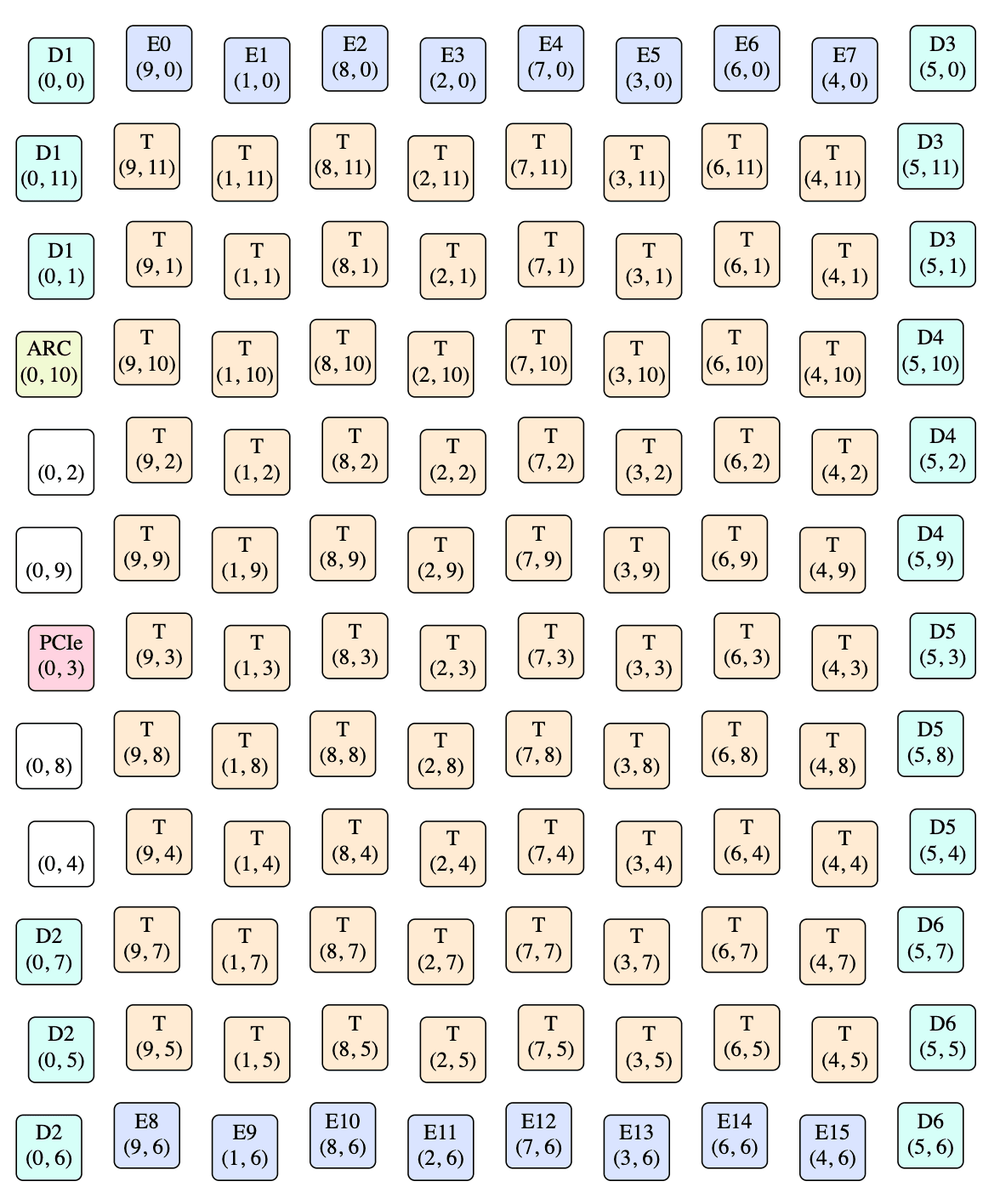 The various tile-to-tile connections aren't shown on the above, as it would be a horrible mess of overlapping and dodging lines. It does however match the circuit board photos: the DRAM tiles are on the left and right edges, and tiles routing to the same DRAM chip are adjacent (e.g. the three D5 tiles are physically adjacent, even though their logical Y coordinates are 3, 8, 4). The ethernet tiles also end up on the physical edges, which makes sense. Thankfully, software mostly doesn't need to worry about this interleaving (except for HARVESTING_NOC_LOCATIONS, which you'll note are the Y coordinates of an interleaved column of T tiles), and can instead stick to the original logical view: