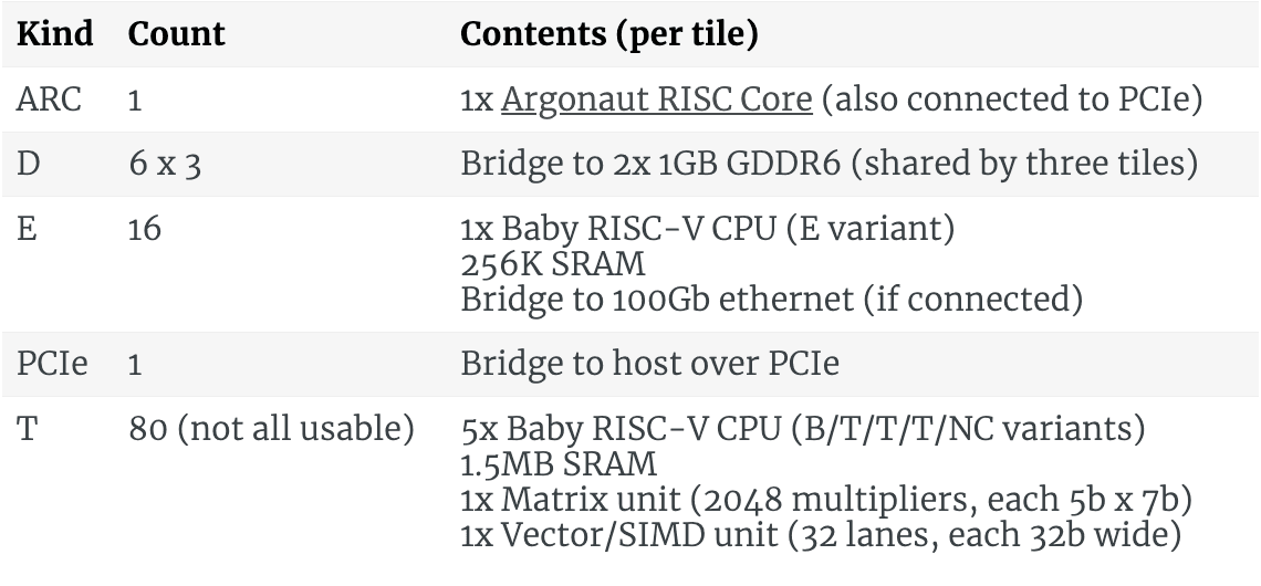 The Wormhole ASIC itself is described as a 10 by 12 grid of tiles, arranged as: