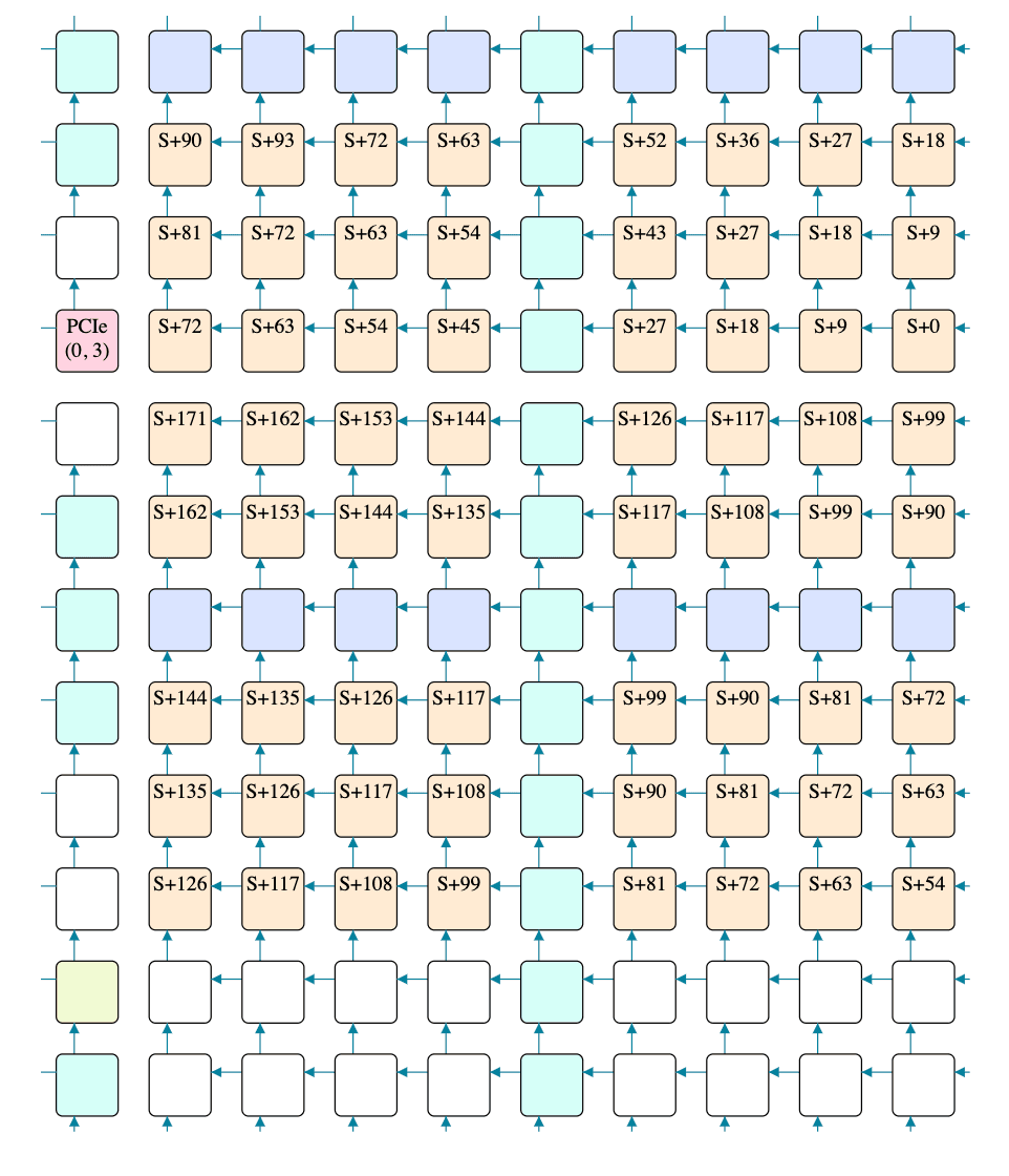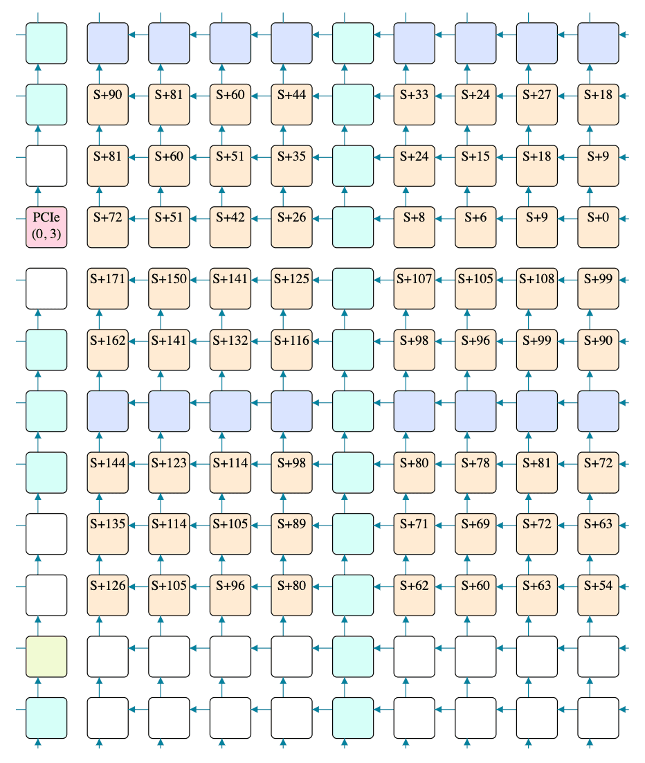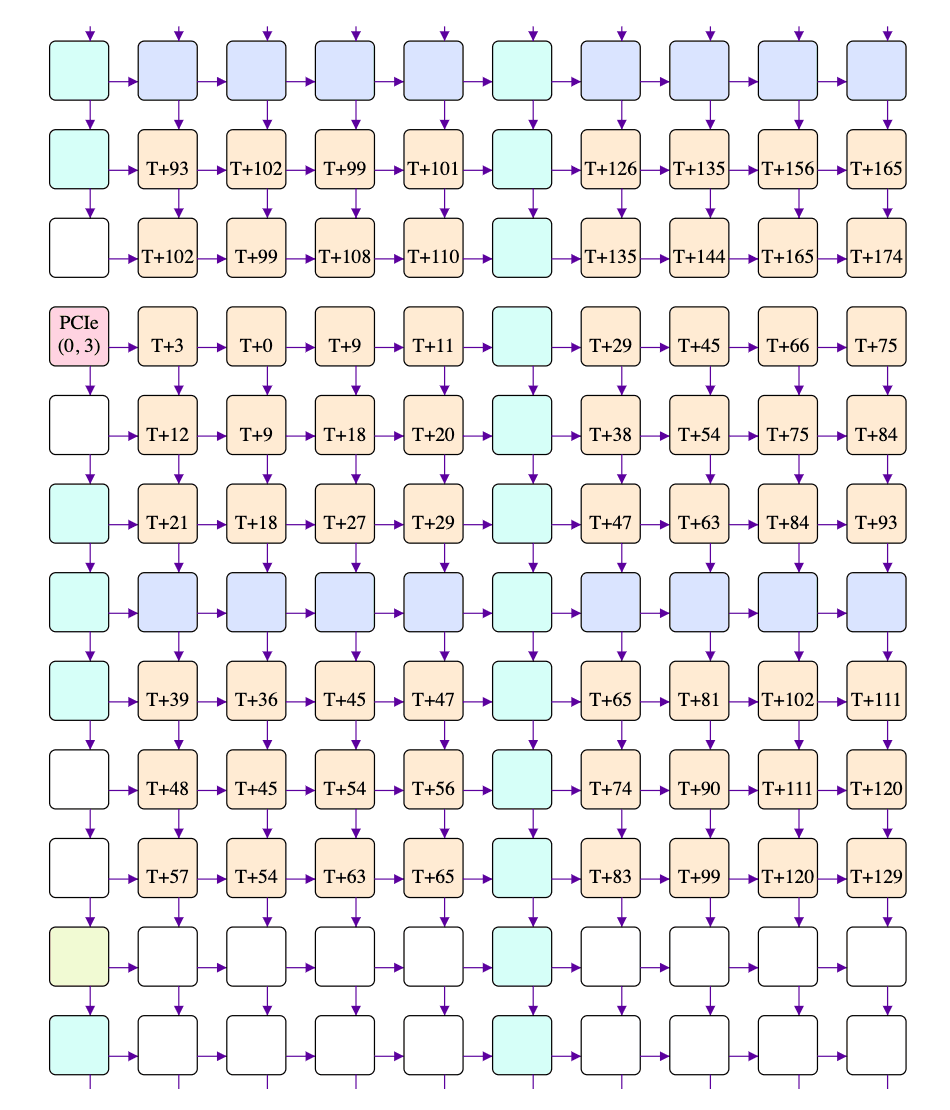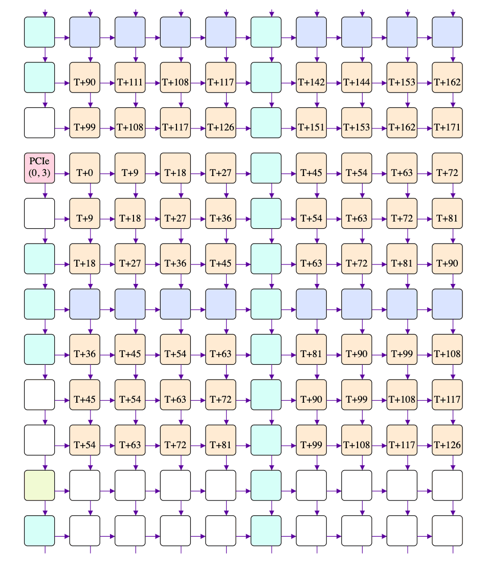 Going rightwards, the first tile is "T+3" and the last is "T+75", meaning 72 cycles to traverse 8 tiles. Going leftwards, the first tile is "S+0" and the last is "S+72", again meaning 72 cycles to traverse 8 tiles. However, going rightwards, the 2nd tile is "T+0", which isn't great: taken at face value it would mean that the multicast reached the 2nd tile before reaching the first, which is clearly nonsense. There is one obvious explanation for this: the cycle counters on different tiles aren't perfectly aligned - they're meant to all start from 0 when the chip powers on, but powering on is a physically complex process, so some tiles might start counting a few cycles before or after others.
